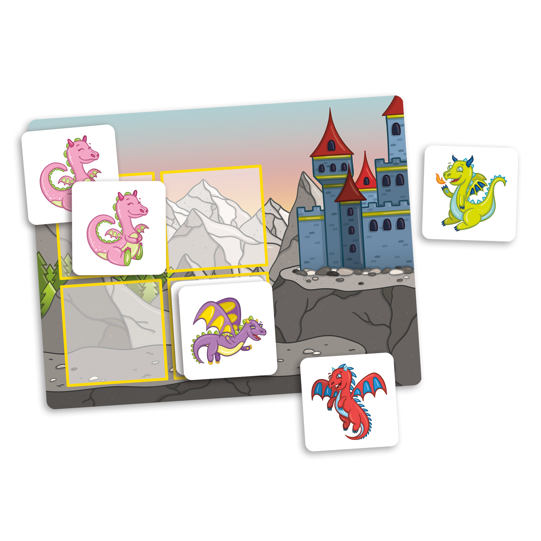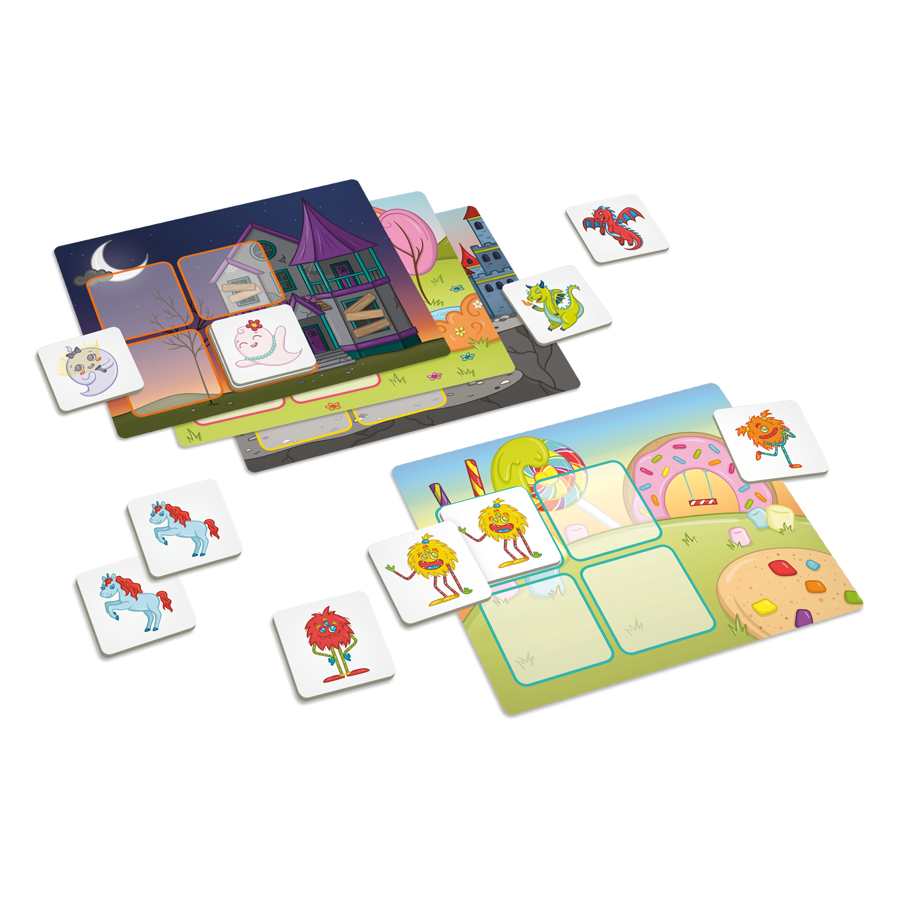 Les monstres, les licornes, les fantômes et les dragons se sont cachés! Concentre-toi, observe bien et essaie de te rappeler où sont les jumeaux! Tu pourras ensuite les aider à regagner leur monde.