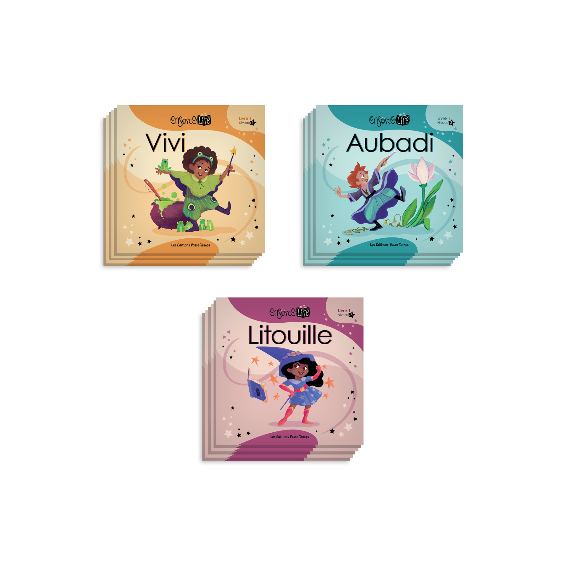 Ensorce-Lire est une collection de livres gradués et décodables qui s'adresse aux lecteurs débutants. Les personnages des livres – des sorciers et des sorcières – amènent les lecteurs à prononcer des formules magiques avec eux et à découvrir les résultats des sorts d'une page à l'autre des livres. Les textes comprennent des pseudomots (les formules magiques) ainsi que des mots faciles à décoder. La collection offre trois niveaux qui intègrent progressivement des graphèmes plus complexes.