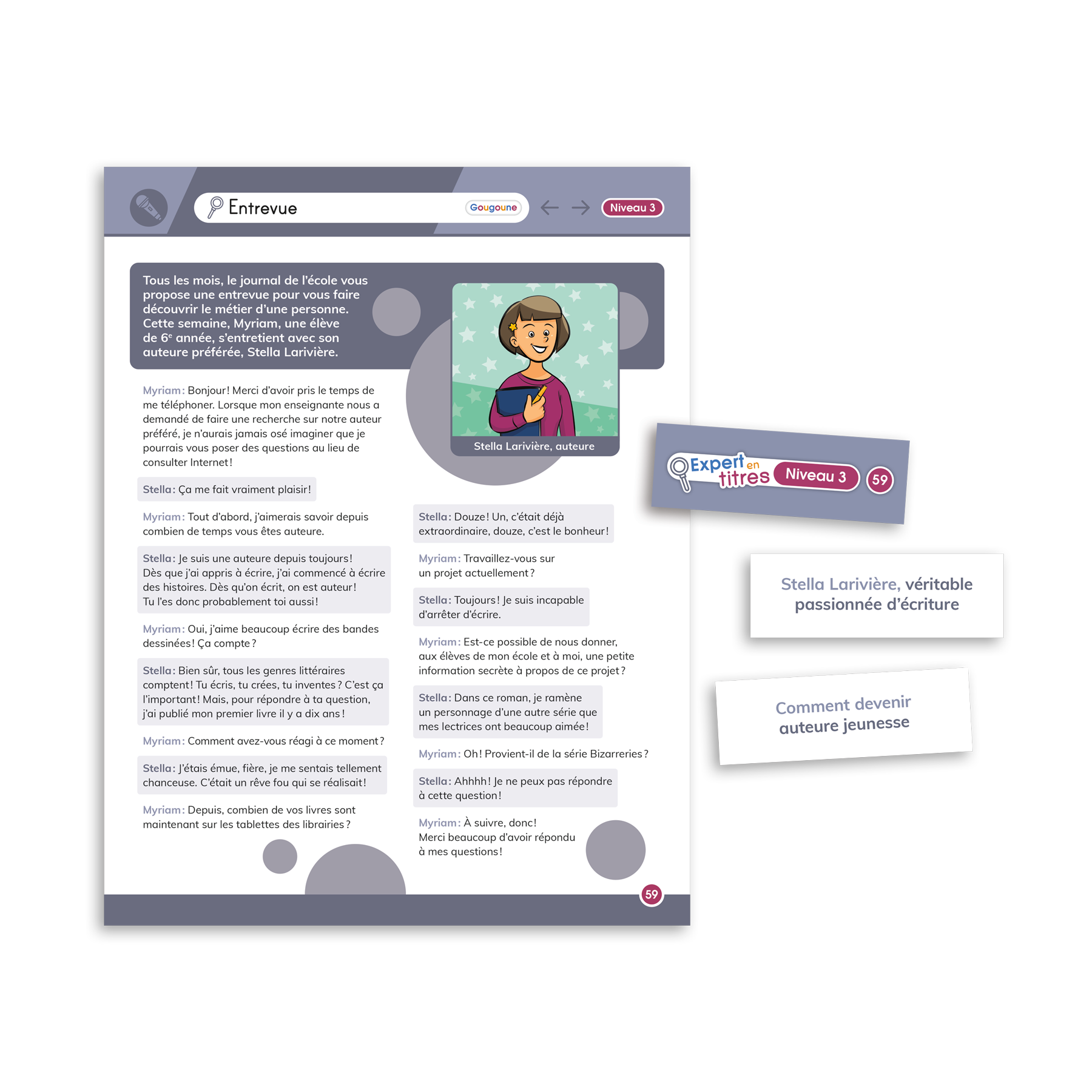 Jeu de lecture gradué pour les élèves de la 3e à la 6e année du primaire ciblant l’habileté à dégager l’idée principale d’un texte. Les joueurs viennent en aide aux titreurs du moteur de recherche Gougoune en trouvant des titres adéquats aux textes contenus dans l’énorme bibliothèque numérique qui ont tous été effacés par un virus informatique.