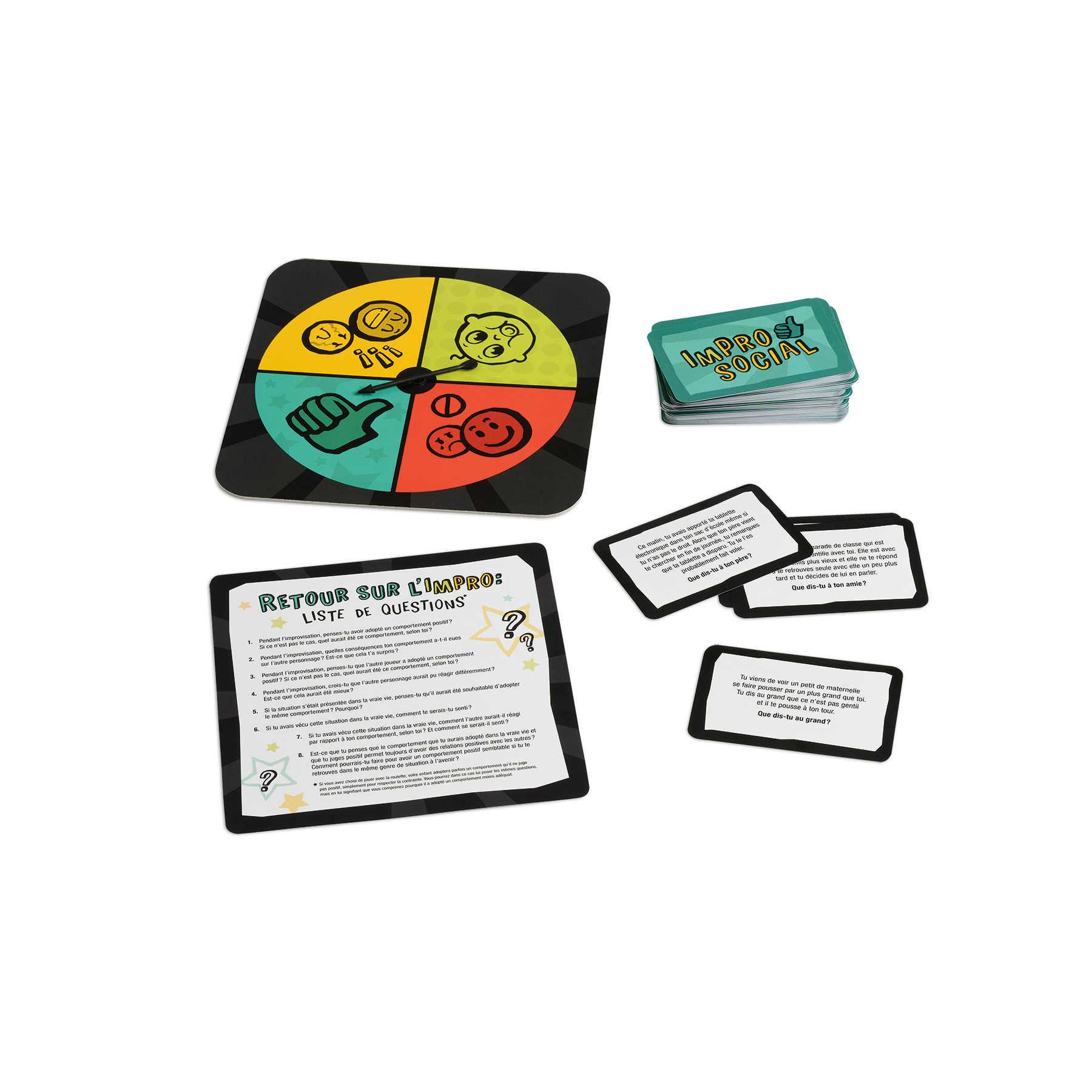 ImProsocial est conçu pour aider les jeunes de 8 à 14 ans à réfléchir aux différents comportements qu’ils peuvent adopter dans des situations qui mettent leurs habiletés sociales au défi. La roulette qui les invite à faire une improvisation de manière émotive, neutre, enfantine ou prosociale les aide à pousser leur réflexion.