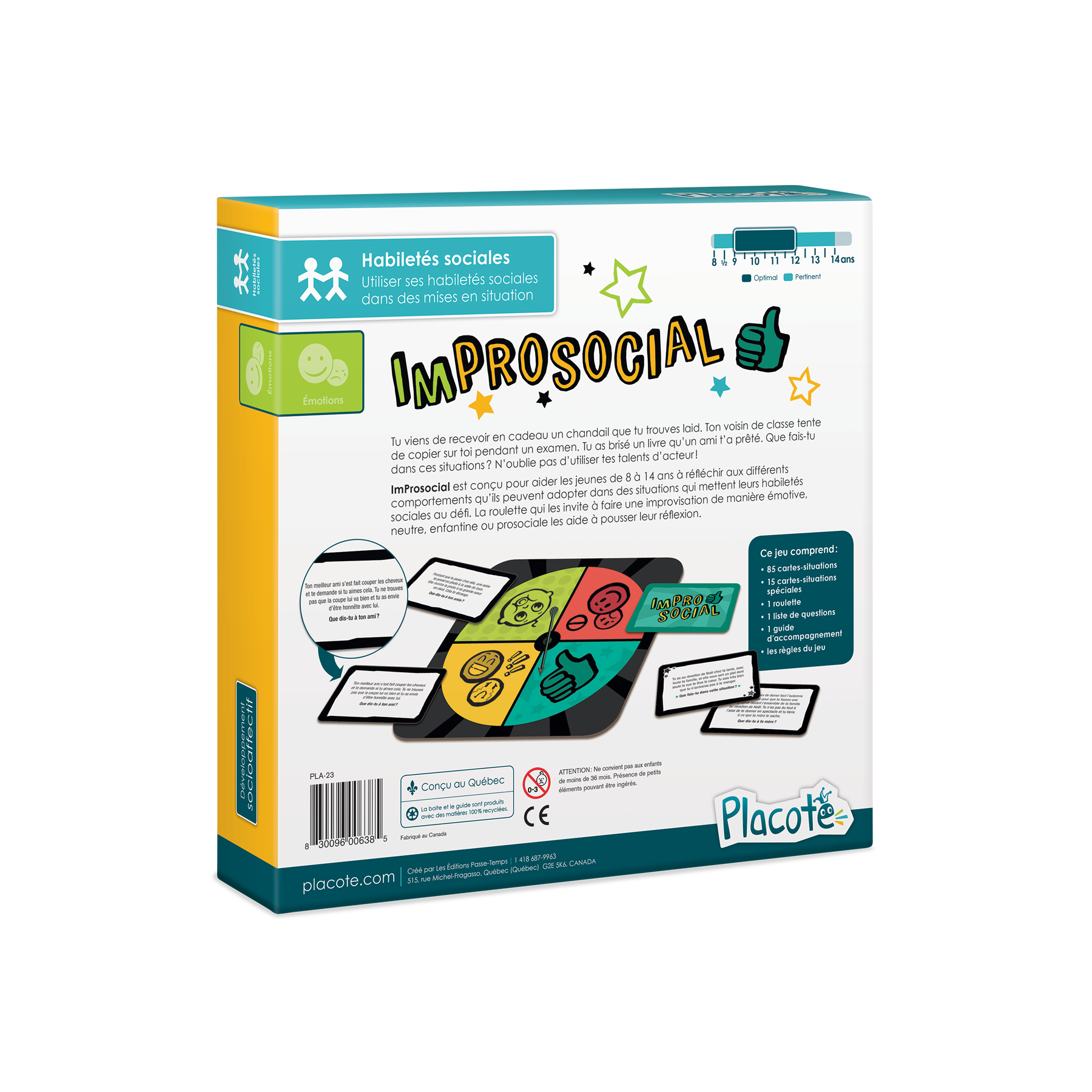 Le jeu ImProsocial est pertinent pour les jeunes de 8 à 14 ans, car il présente des mises en situation qui ont été pensées pour eux, autant sur le plan des habiletés ciblées que de celui des contextes proposés. Le fait que l’enfant peut se mettre en action dans ces situations fictives l’aide à adopter de nouveaux comportements positifs qu’il n’aurait peut-être pas eus au quotidien. L’enfant a ainsi l’occasion de développer des habiletés sociales qu’il sera en mesure d’utiliser lorsqu’il vivra réellement une situation semblable.
