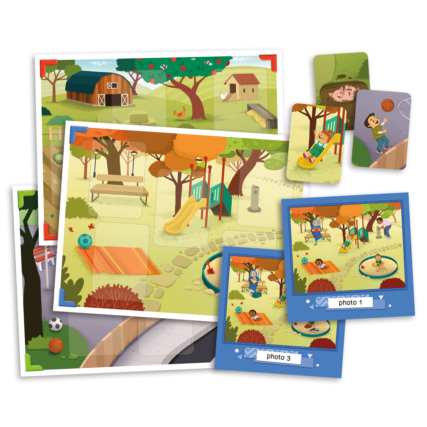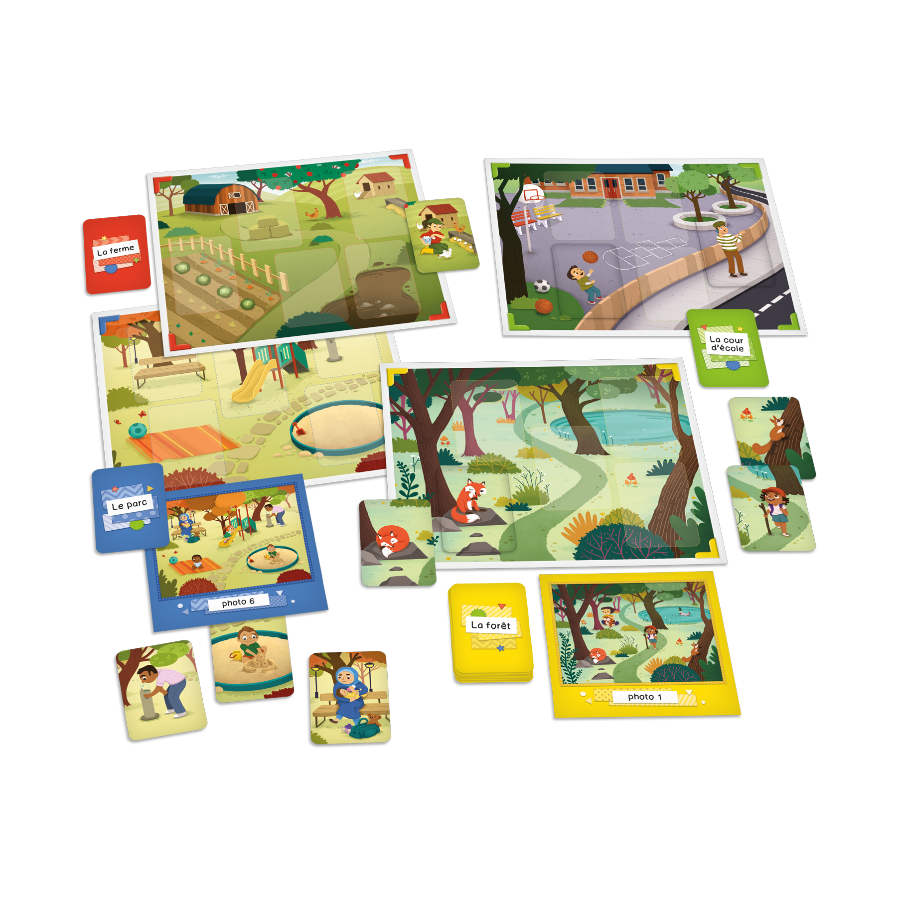 Jeu destiné aux enfants de tout âge présentant des difficultés à produire à l’oral des phrases comprenant des subordonnées relatives. Le joueur qui décrit doit utiliser des phrases comportant le pronom qui pour décrire des personnages illustrés sur une image (p. ex. : « Mets l’écureuil qui monte dans l’arbre. »). Le joueur qui écoute doit choisir les cartes des bons personnages faisant les bonnes actions et les placer sur la planche de jeu. Au résultat, la scène décrite et celle de la planche de jeu doivent être identiques.