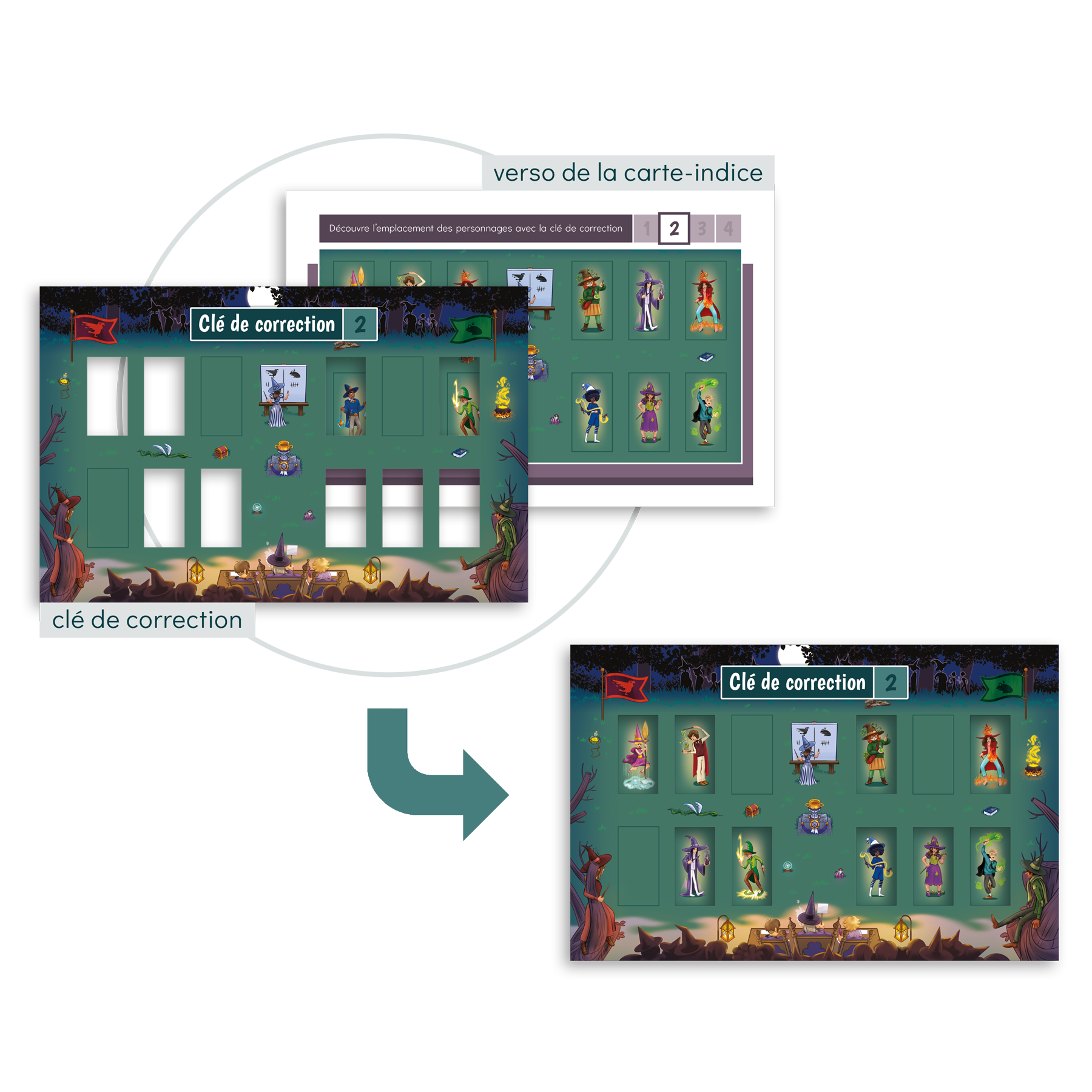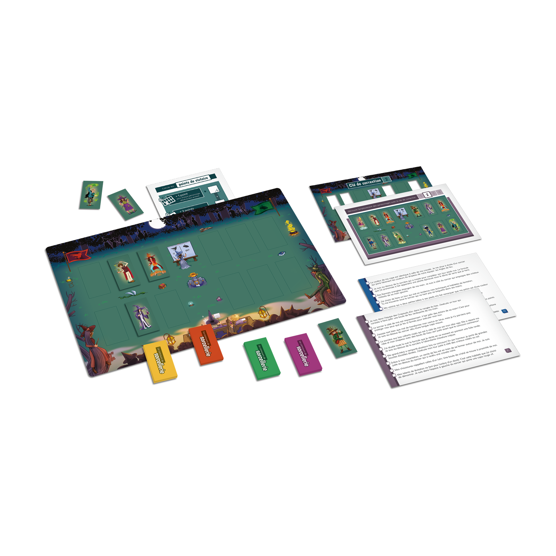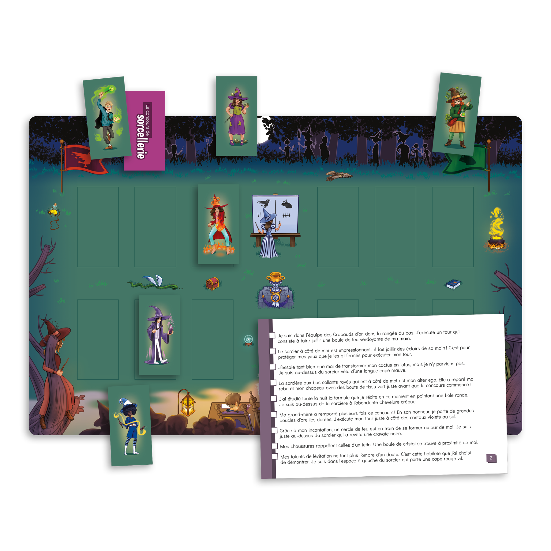 Le concours de sorcellerie est un jeu de lecture individuel destiné aux élèves de 5e et 6e année du primaire ciblant la compréhension en lecture et le raisonnement logique. Chaque joueur doit découvrir l’emplacement des sorciers qui prennent part à un concours de sorcellerie à l’aide d’indices qu’il doit lire et relire en vue de marquer des points. Il se corrige lui-même en utilisant une clé de correction trouée qui dévoile les bons emplacements des personnages.