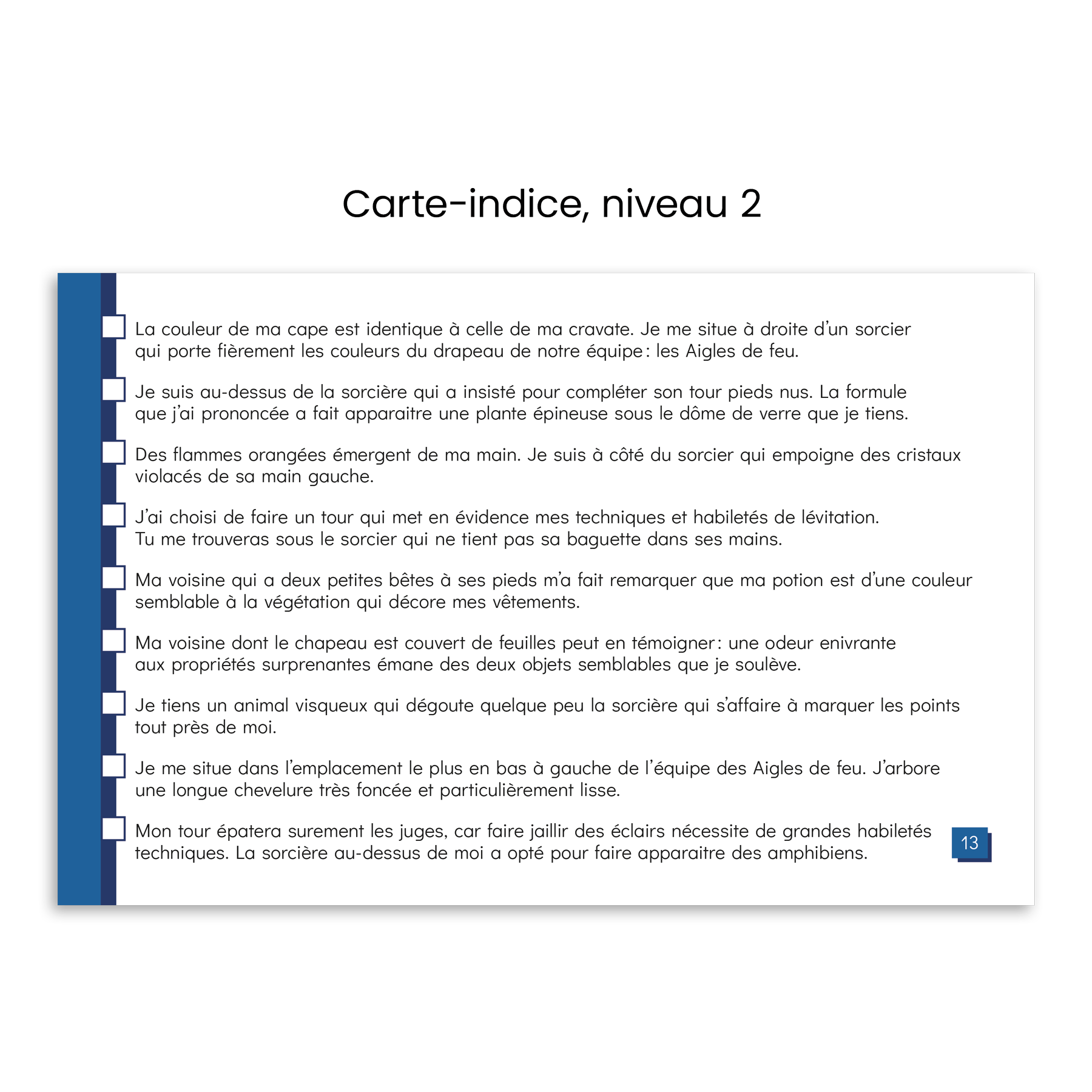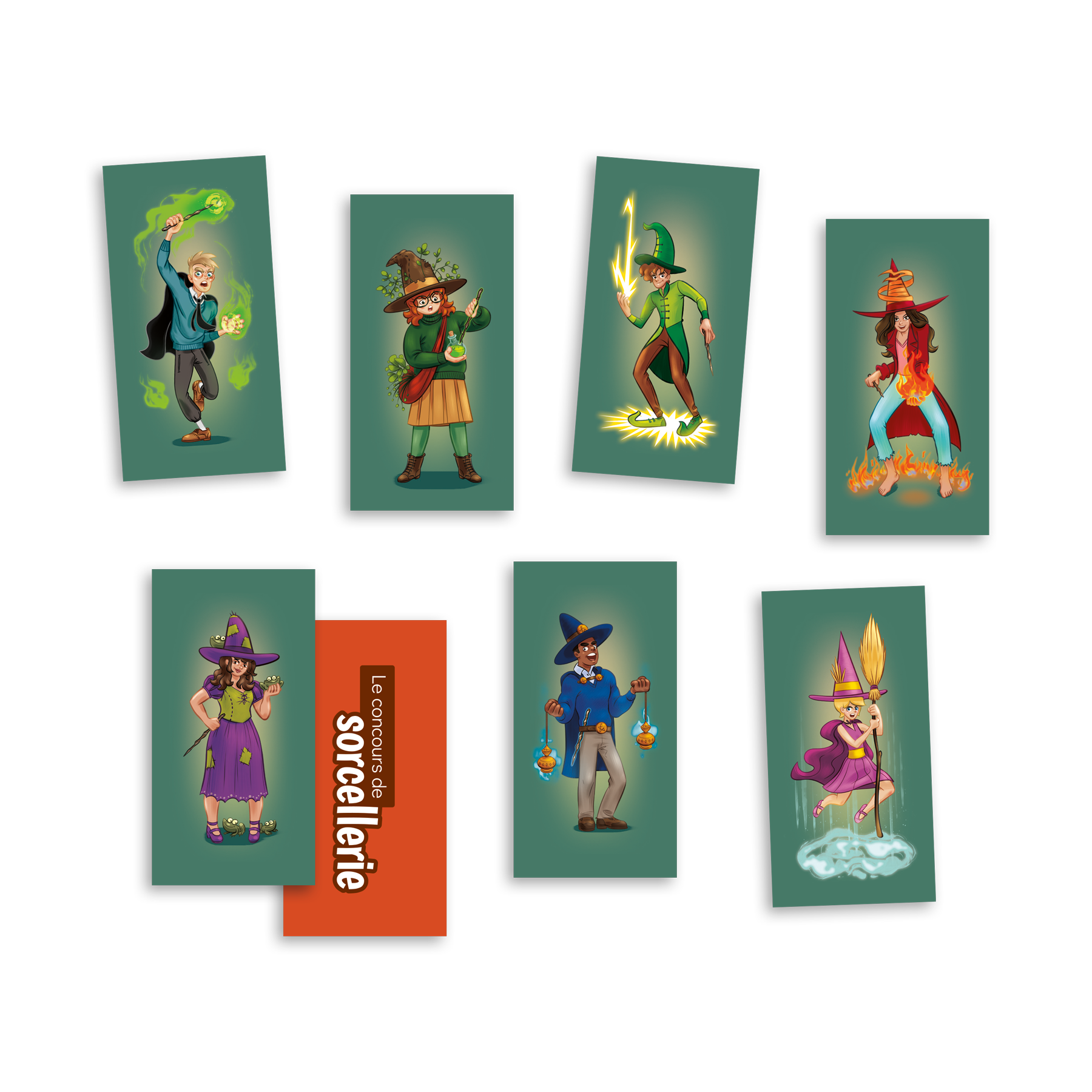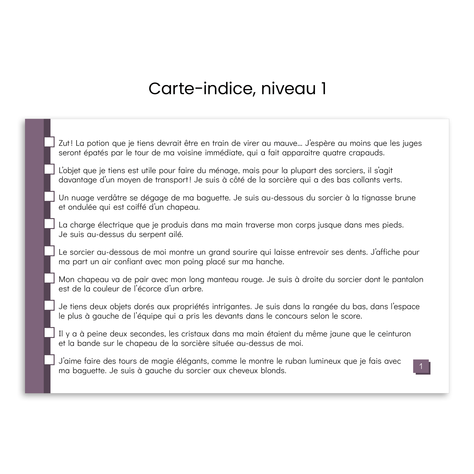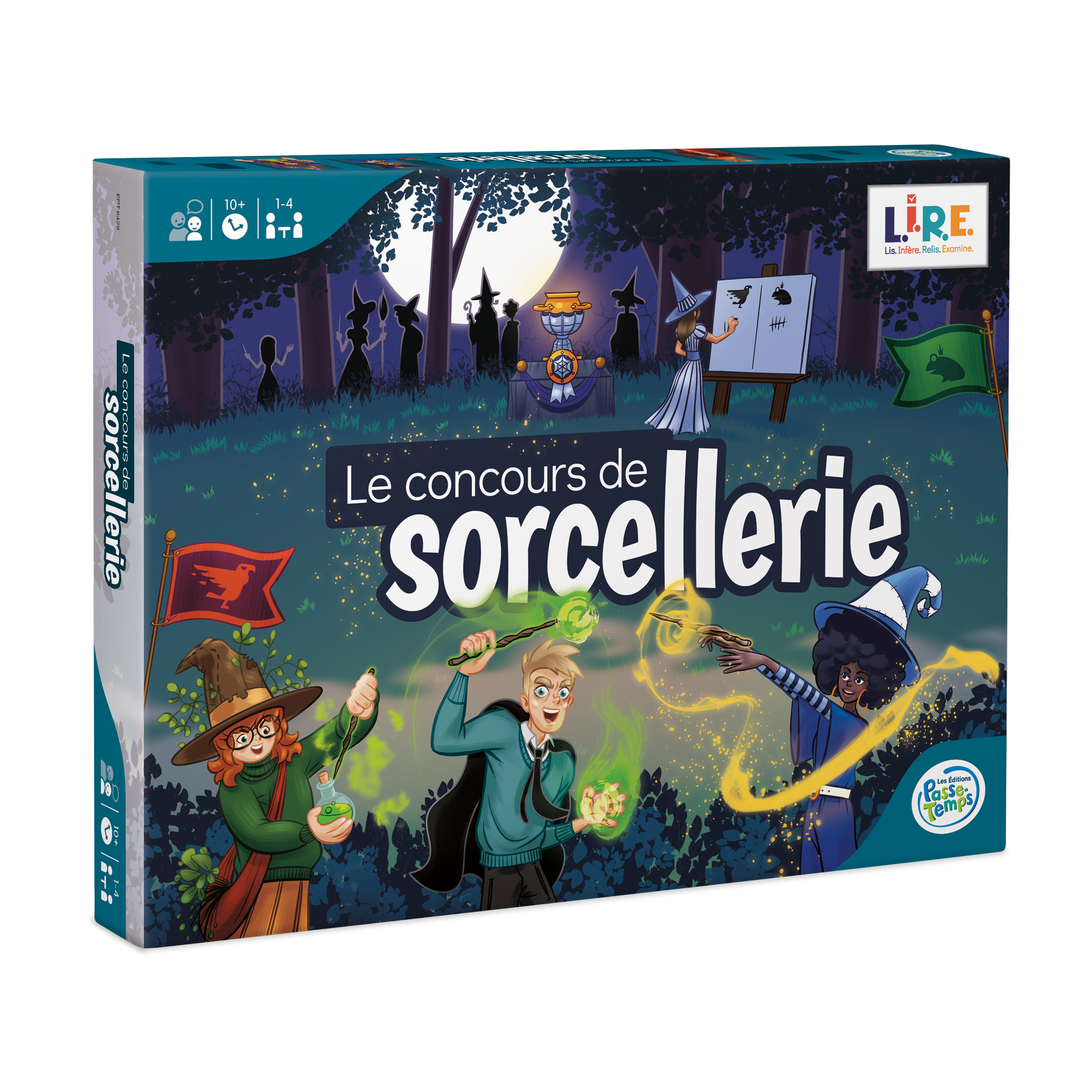 Le concours de sorcellerie est un jeu de lecture individuel destiné aux élèves de 5e et 6e année du primaire ciblant la compréhension en lecture et le raisonnement logique. Chaque joueur doit découvrir l’emplacement des sorciers qui prennent part à un concours de sorcellerie à l’aide d’indices qu’il doit lire et relire en vue de marquer des points. Il se corrige lui-même en utilisant une clé de correction trouée qui dévoile les bons emplacements des personnages.