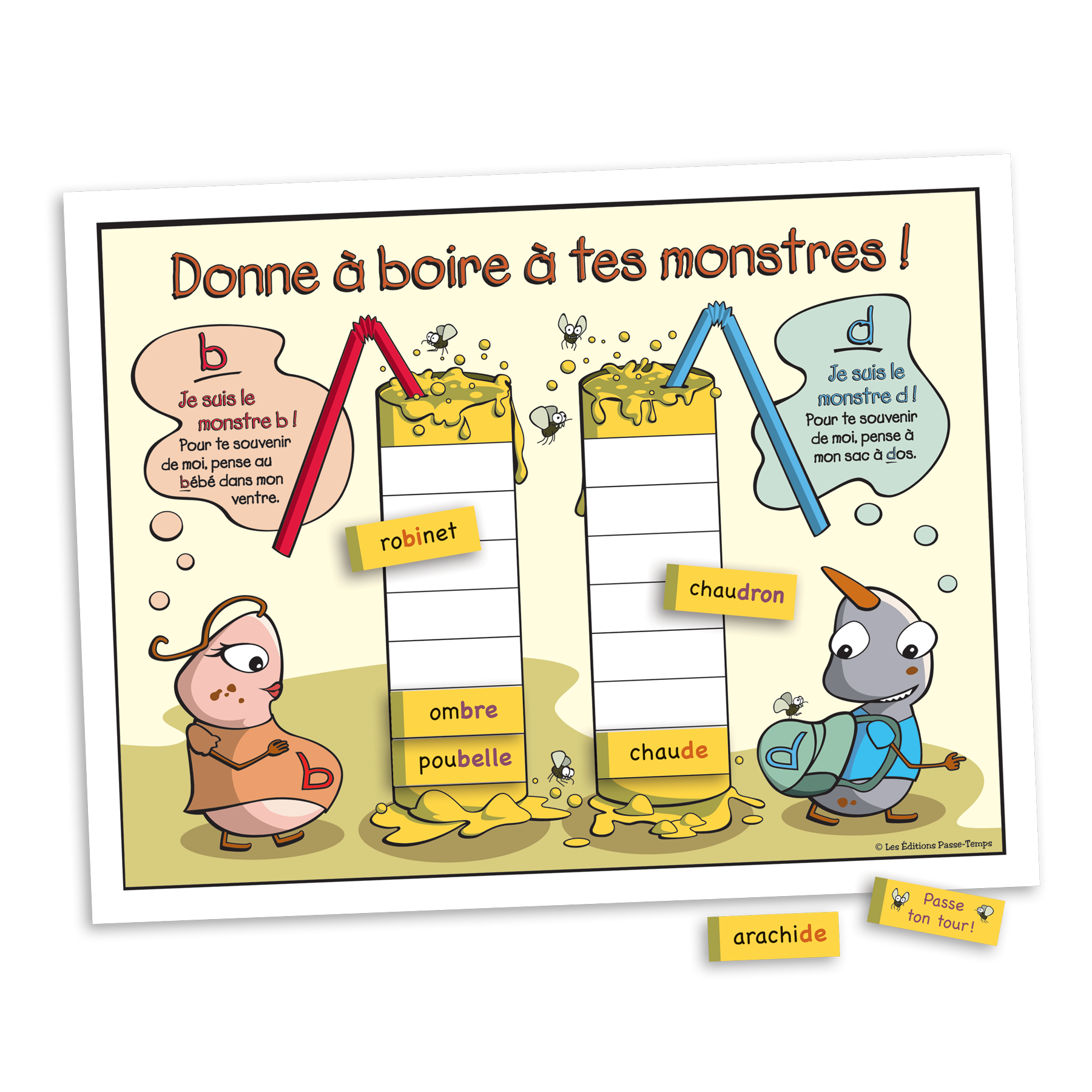 Pour aider ces monstres amusants qui aimeraient bien avoir à boire, chaque joueur prend d’abord une planche de jeu. Un monstre correspondant à chacun des deux graphèmes y est représenté avec un verre vide. L’élève doit être le premier à remplir les verres des deux monstres. Pour les abreuver, il doit piger un mot contenant un des graphèmes ciblés, le lire correctement, identifier le son travaillé et placer la carte dans le verre du monstre correspondant.