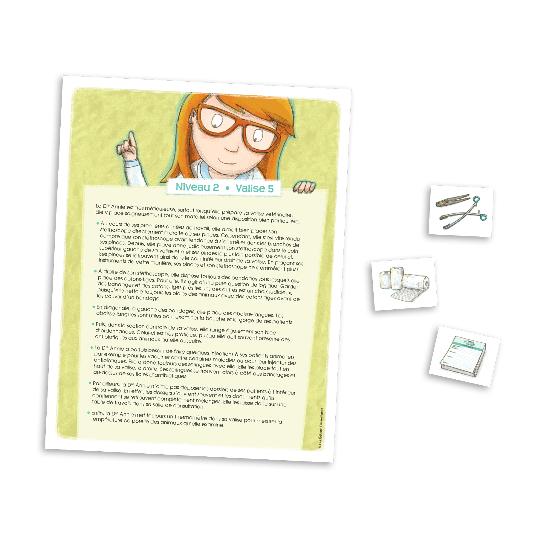 À partir d’indices fournis dans un texte descriptif, les élèves doivent sélectionner neuf instruments et autre matériel de médecine vétérinaire et les disposer aux endroits appropriés dans la valise d’un des docteurs.