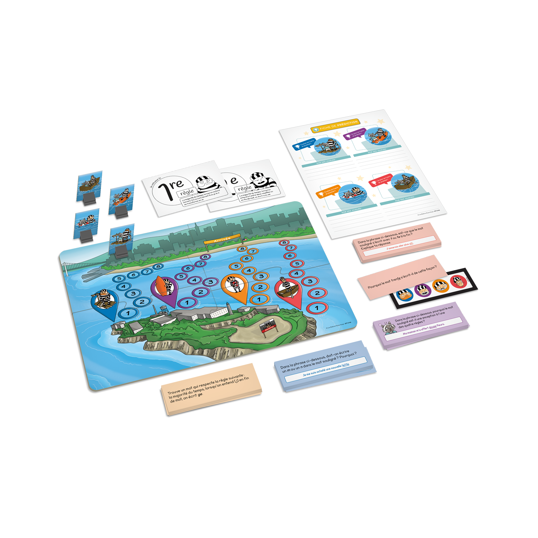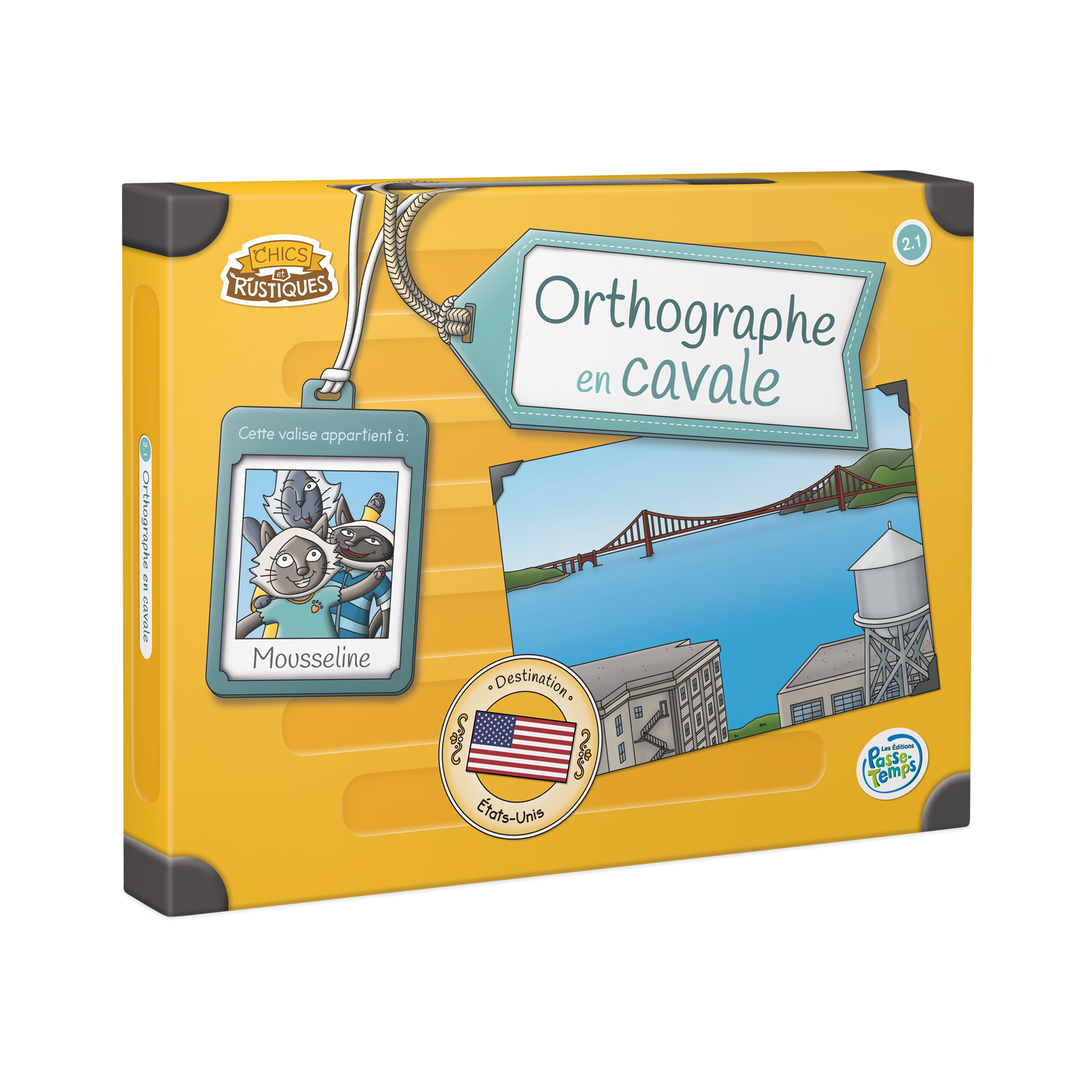 Orthographe en cavale est un jeu de parcours destiné aux élèves de 2e année du primaire ciblant l’apprentissage de quatre règles d’orthographe lexicale. Les joueurs doivent appliquer les différentes règles orthographiques pour découvrir quel prisonnier de la prison d’Alcatraz mènera Mousseline jusqu’à la rive.
