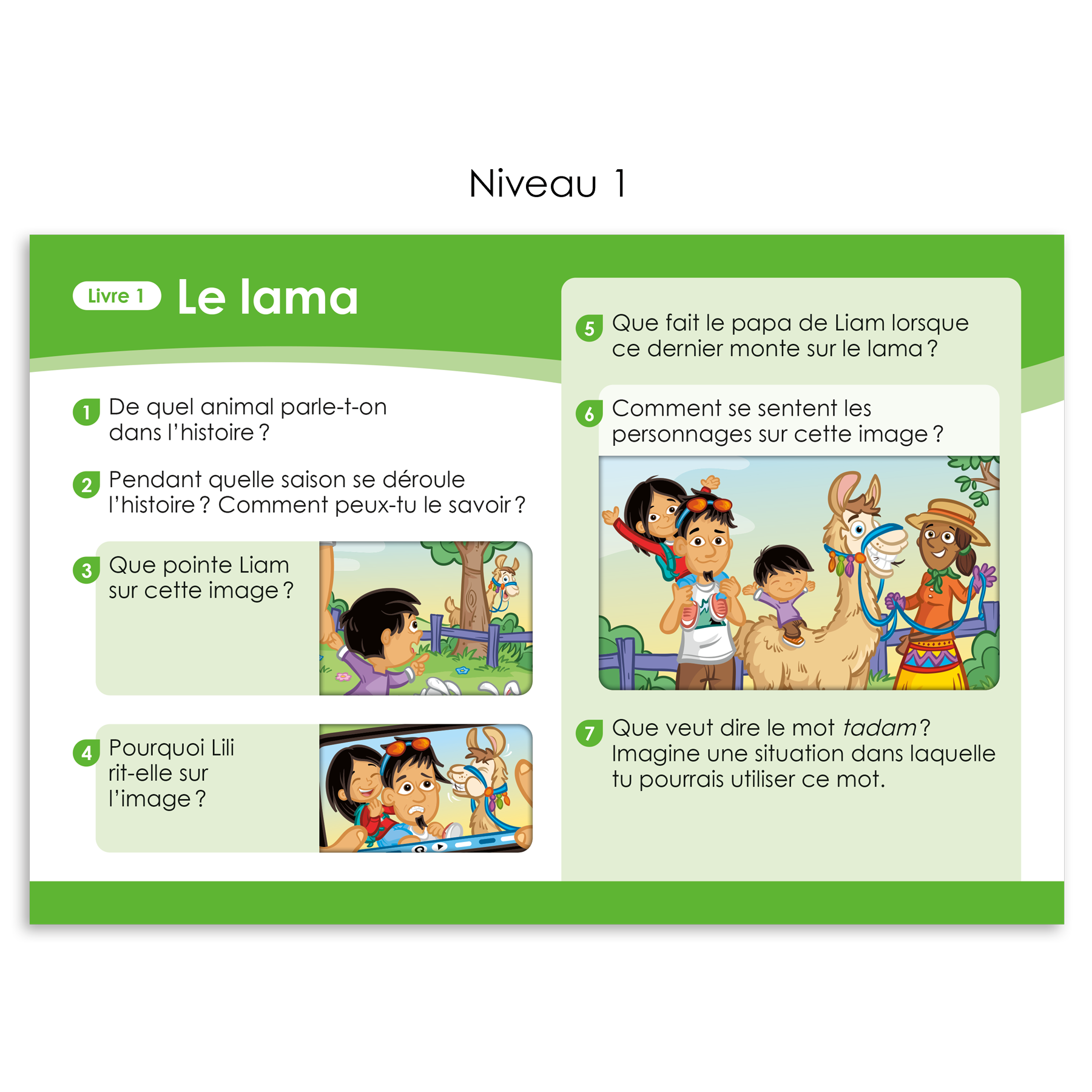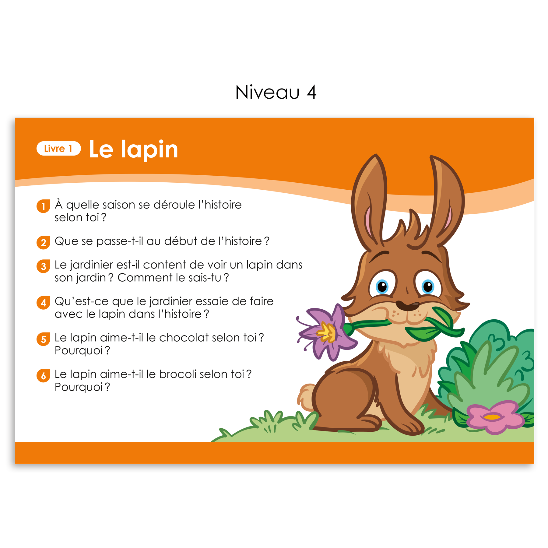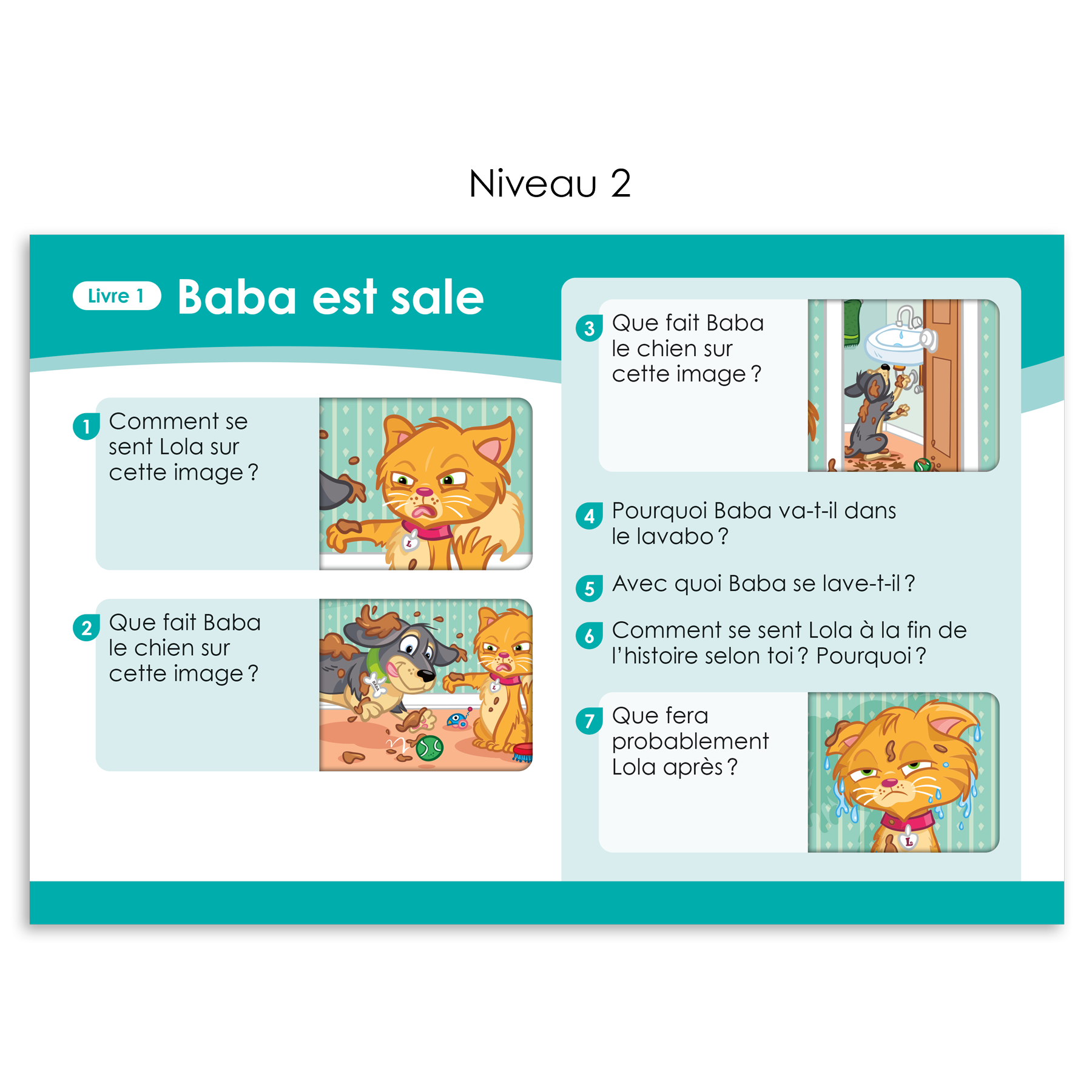 Les fiches de questions sont séparées et organisées dans le boitier selon les six niveaux de l'échelle Décode. Pour chaque livre, 6 à 8 questions sont formulées. Les questions sont posées à l'élève ou aux élèves après la lecture d'un livre. L'élève ou les élèves répondent oralement aux questions et peuvent retourner lire le livre ou un passage du livre au besoin pour y répondre. La trousse comprend également un corrigé destiné à l'intervenant.