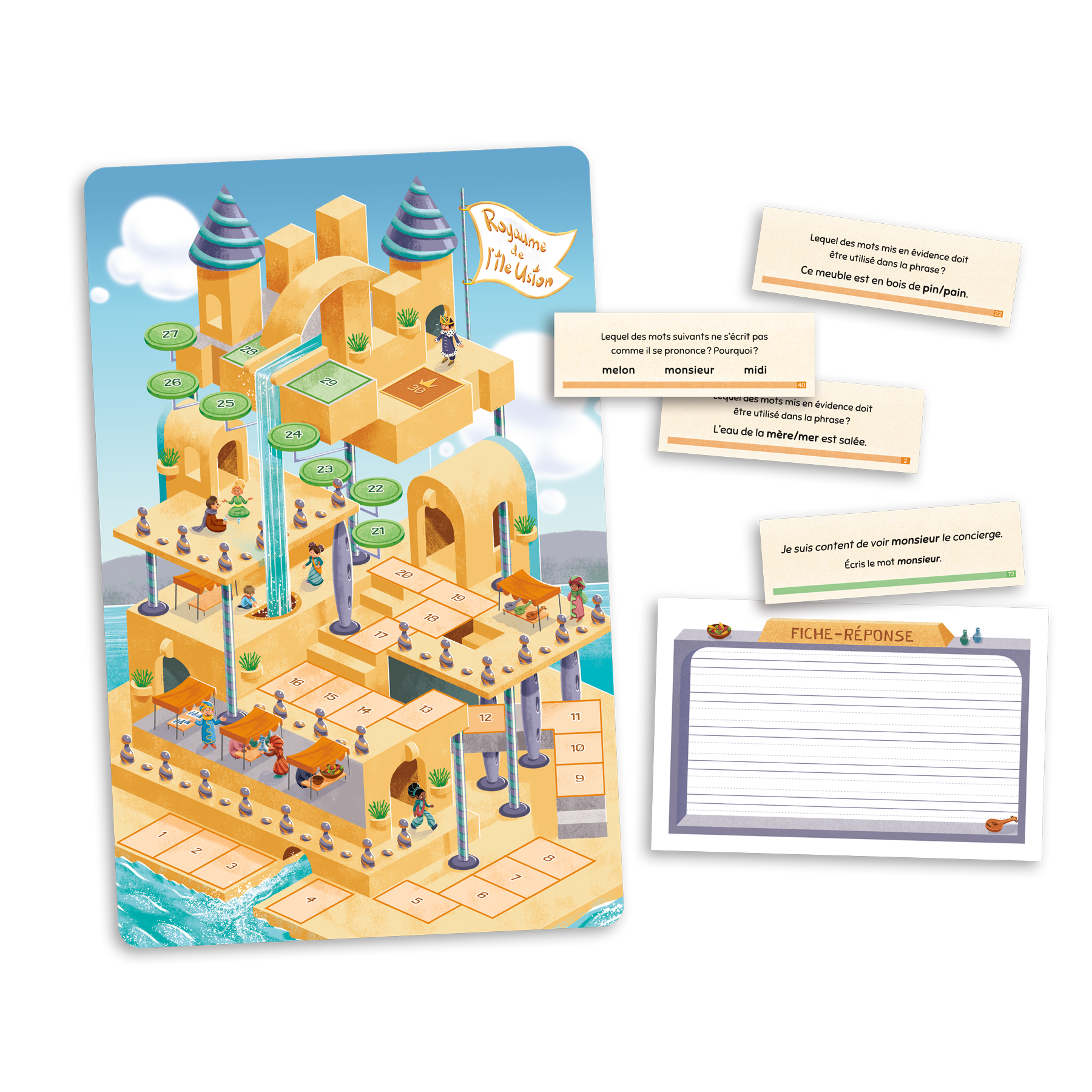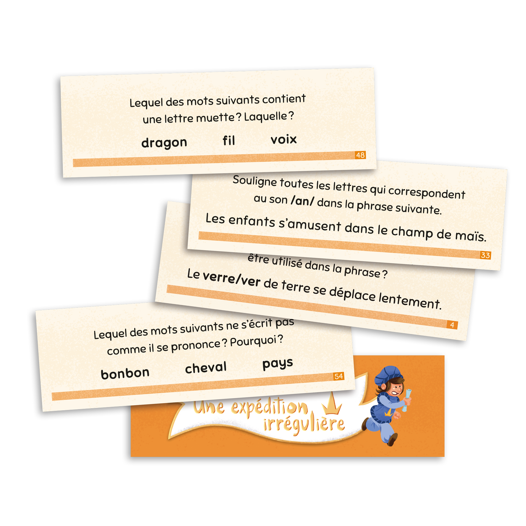 Une expédition irrégulière est un jeu destiné aux élèves de la 1re à la 3e année du primaire qui cible l’analyse de mots présentant une particularité ou une irrégularité orthographique. Les joueurs sont des messagers qui doivent transmettre une importante missive au roi en analysant les particularités orthographiques des mots.